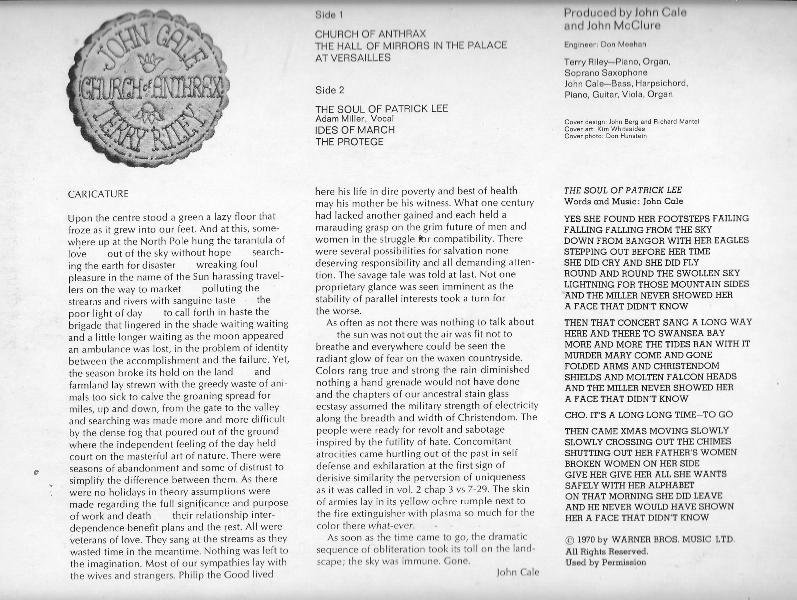La mano di Riley è particolarmente avvertibile nella splendida title track, "Church of Anthrax" nove minuti dove si incontrano quasi una variazione sul gioioso tema pastorale di "A Rainbow In Curved Air" che si scontra con i climi psicotici degni dei migliori VU. Anche il lungo deliquio pianistico con contrappunti del sax soprano di Riley di "The Hall Of Mirrors In The Palace Of Versailles" è farina del sacco del compositore californiano ed è probabilmente il punto in cui Riley e Cale si approcciano l'un l'altro su un piano di parità.