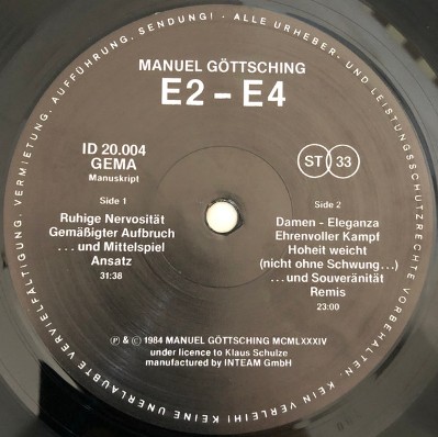Realizzazione Göttsching e Schulze si riunirono alla fine del 1981 per un tour di improvvisazione; al termine del quale concordarono di incontrarsi di nuovo per esibirsi ad Amburgo. Il giorno prima della partenza, il 12 dicembre del 1981, nel suo “Studio Roma” a Berlino, Göttsching realizza un brano musicale che riversa su nastro, per ascoltarlo in aereo. Il risultato è una traccia sperimentale di 58 minuti intitolata E2-E4. Di questo pezzo non parla per anni con nessuno, fino a quando non lo fa sentire a Richard Branson nella sua barca. L’aneddoto – raccontato dallo stesso Manuel nelle note di copertina della ristampa – narra che il patron della Virgin in quel momento stesse cullando la figlia, che ascoltando il pezzo si addormenta. «Manuel, puoi fare una fortuna con questa musica». Ma Göttsching temendo che ormai la Virgin fosse diventata troppo grande per un lavoro del genere, rifiutò reputando che non avrebbe ricevuto la giusta attenzione. Lo pubblicherà Klaus Schulze ben tre anni dopo, nel 1984, con sua Inteam, in sole mille copie. Ne furono vendute pochissime copie e venne ripescato solo quando fu campionato per la mega hit Sueño Latino (1989). E2-E4, insomma, vive di gloria postuma, ma nel frattempo è diventato il seme di tutta l’elettronica moderna. |